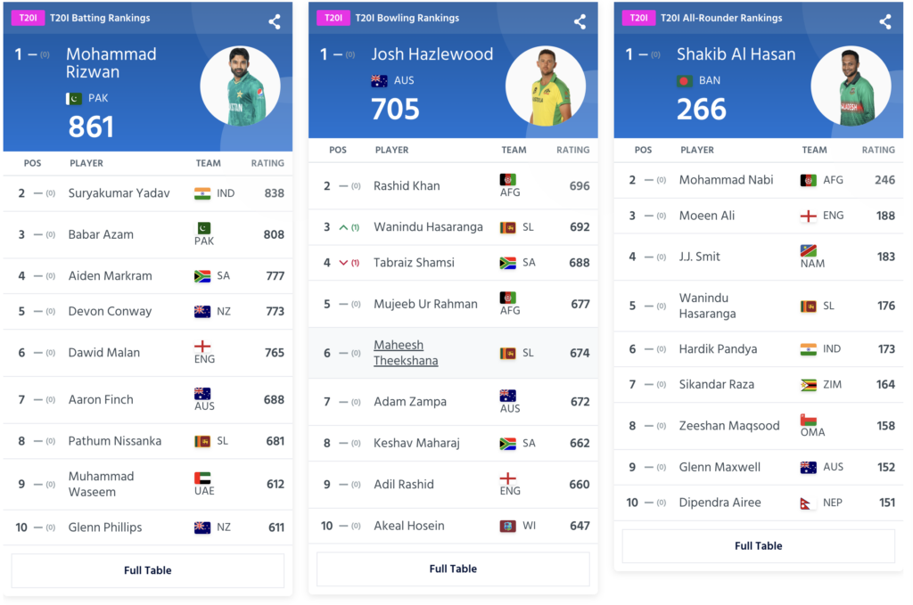 Pakistan’s Mohammad Rizwan holds the first position in the T20I batting rankings, while Australia’s Josh Hazelwood leads the bowling rankings. The number 1 T20I all-rounder is Shakib Al-Hasan from Bangladesh.